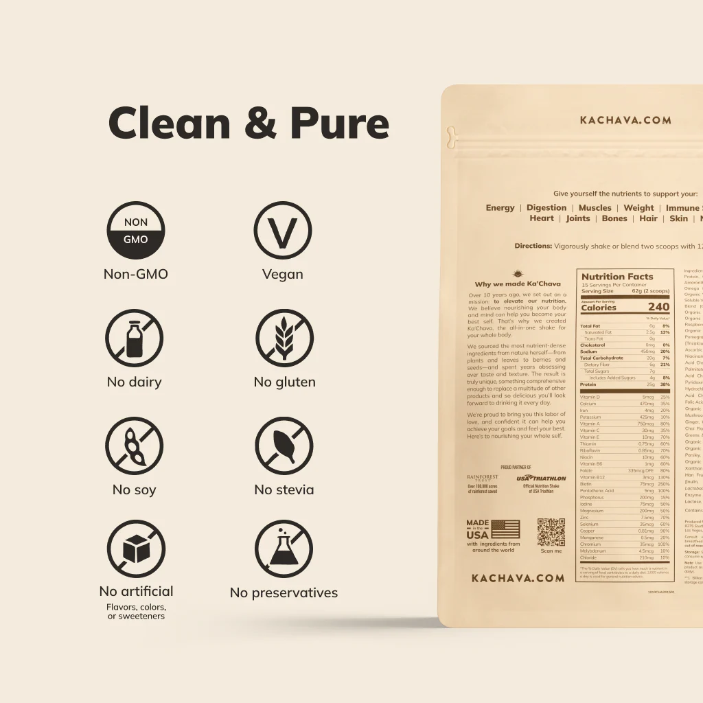 A shake made with two scoops of Ka'Chava offers a whopping 25g of 100%plant-protein. This comes from a variety of quality plant-based sources.including pea protein, sacha inchi, brown rice, amaranth, and quinoa. Alltogether, they combine to make a complete protein and give you all nine ofthe essential amino acids your body needs to thrive.